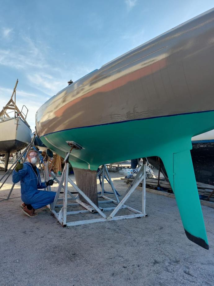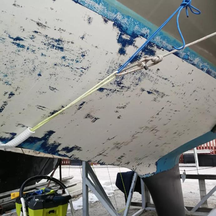 - Kuten veden yläpuolisten osien maalauksessa, työ alkaa vanhojen maalikerrosten poistamisella. Pohjaan maalatut maalit ovat ympäristölle haitallisia, joten ne tulee kerätä talteen. Sekä kaavin, että hiomakone tulee olla liitettävissä pölynimuriin.